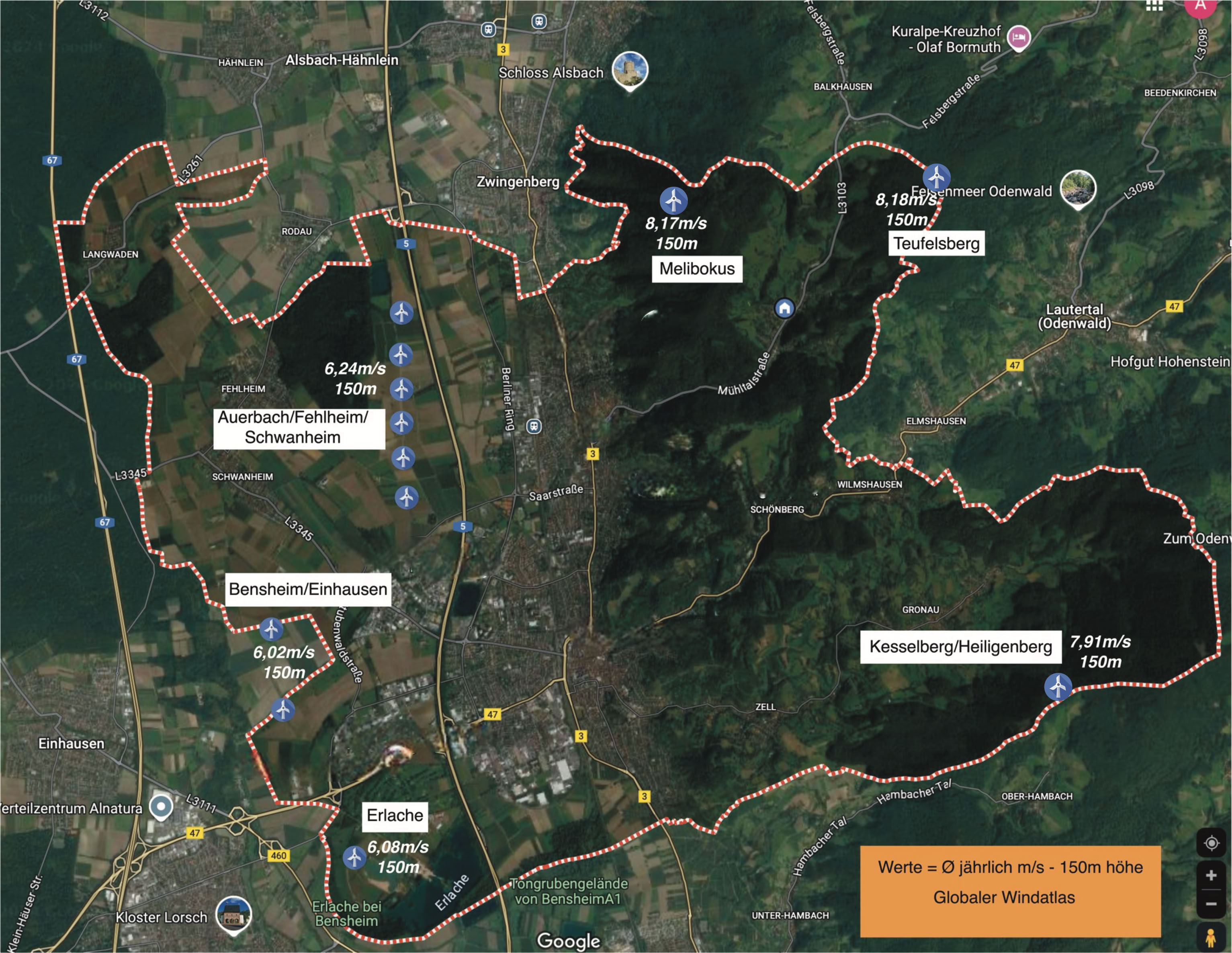 Im Papier „Energiewende für Bensheim“ der Stadt Bensheim vom August 2023 wurden mögliche Gebiete für Windkraft gezeigt. Wir haben uns die Gebiete, in der Gemarkung Bensheim, näher angeschaut.